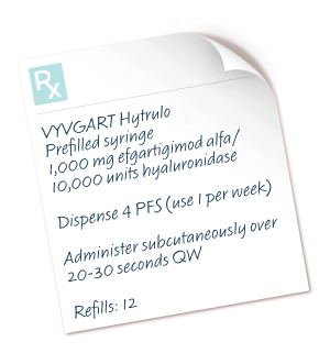 *After proper instruction on subcutaneous injection technique, a patient or caregiver may inject VYVGART Hytrulo prefilled syringe.1 See full Prescribing Information.